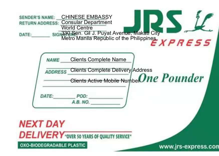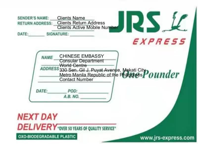 *回邮信封是指您提供给使馆用来将您的新证件和注销后的旧证件(如有)寄回给您的信封。该信封的收件人地址由您自行填写(请使用防水的马克笔),如填写有误或字迹模糊,造成无法投递,您需自行承担后果。请务必填写详细准确的收件人地址,并记录快递单号,以便您自行登录JRS网站(https://www.jrs-express.com/)凭单号跟踪查询邮寄情况。