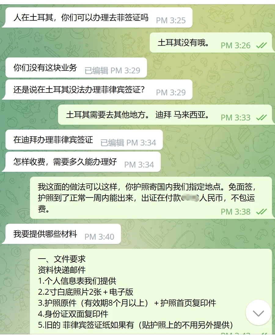 比如这个 马来西亚的菲律宾领馆10月2号开始针对中国人信息有些变化 不能自己申请 只能通过特定机构待申请,万一客人又卡在这个周期 那么他也是很为难是不, 所以这对人在其他国家 那边又不方便申请菲律宾入境签证的,我们保守的做法是 寄护照回中国办理,我们和菲律宾驻华领馆长期有稳定的合作关系,仅需要简单材料就可以免面签办理菲律宾入境签证 周期预计一周左右 然后做完签证后在快快递会你所在国家地址,前后也差不多10-15工作日内,方案比较保障。