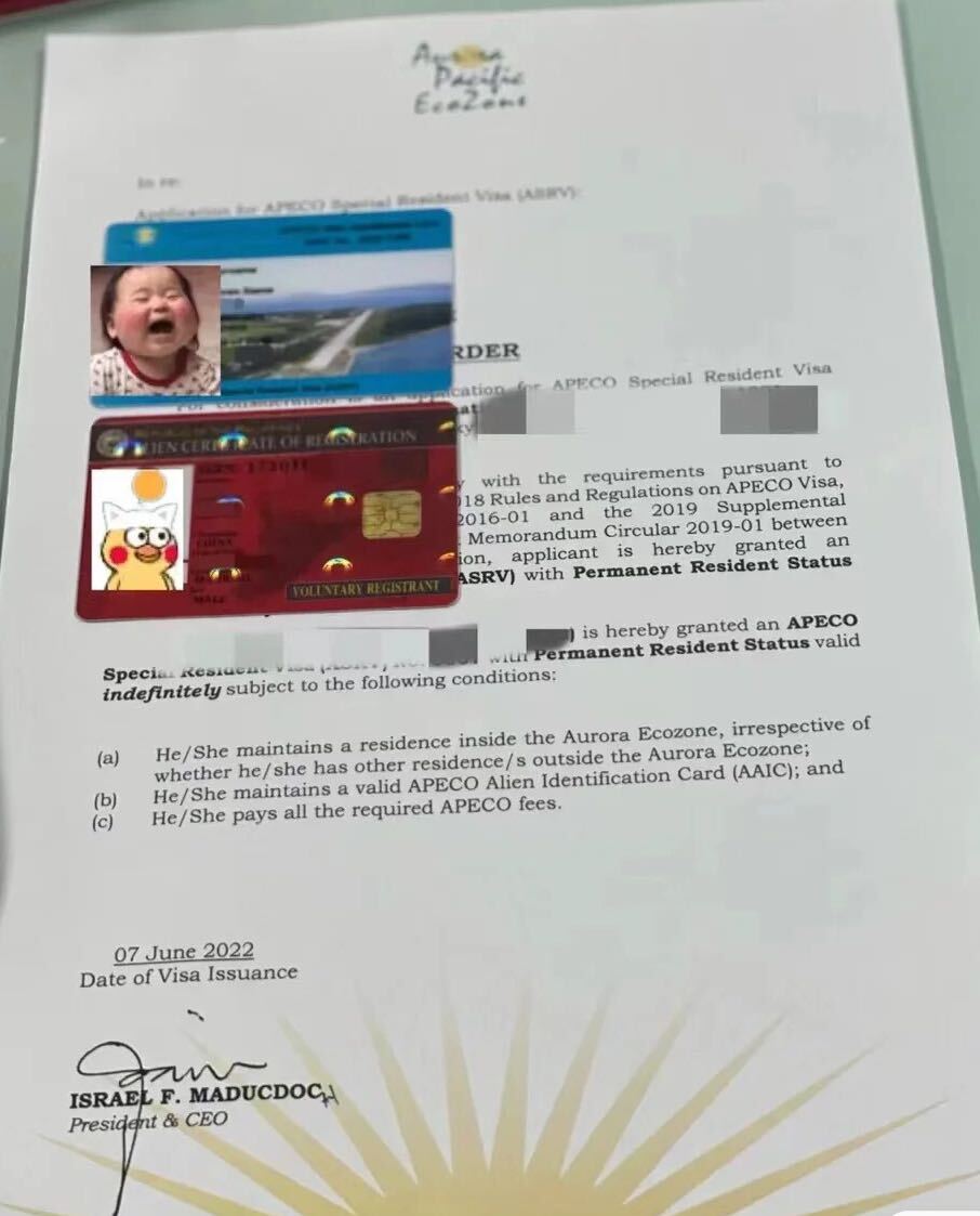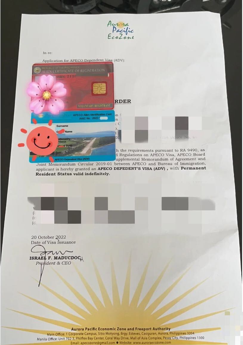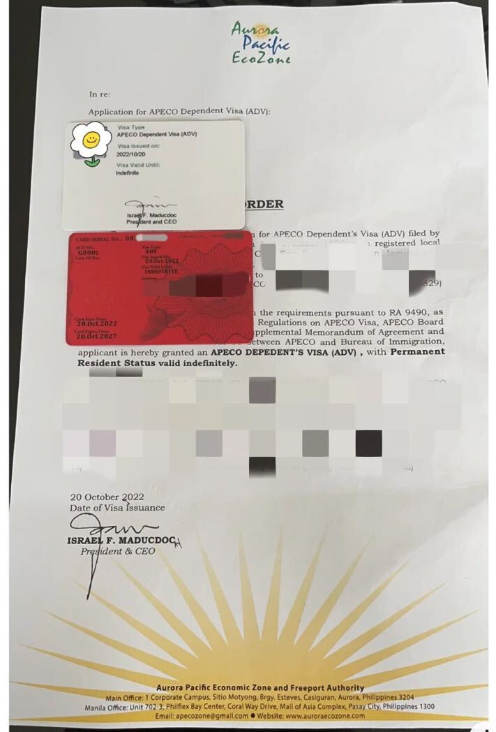 2、附属申申请人境外申请费8000美金/人 C)管理费和维护费用 移民局外国人居住身份证 I-CARD卡使用年限(5年)换卡费用约 60 美金/每人, 每年需向APECO部门交会员年费 户主:240 美金 附属人24 美金: 每年需向移民局办理常年报道(ANNUAL REPORT) 310 比索/人/年。 D)我们全程服务费:4000美金/户。 包含前五年所有会费 温馨提醒: 1、以上一旦申请通过后美金完全不可退还,已经捐赠给菲律宾经济特区做建设了。假若没通过捐款可一次性立刻全额退回。 2、本捐赠费用附属申请人上限为3人 3、 本项目捐赠款项和申请费用均需我司前往代缴,且一次性缴纳,先缴费后申请批文,不管境内境外申请方式都是需要缴费到我们代缴,项目方目前不接受个人直接申请。 4、 整套完整手续 包含 护照贴永居的签证纸,移民局IC防伪身份证(红卡),移民局批文,经济特区批文,经济特区居民身份证。 ASRV 或者 ASIV ADV 的办理所需资料: 1)所有申请人护照首页扫描 2)结婚公证认证(配偶随行申请需要提供) 3)出生公证认证(孩子随行申请需要提供) 5) 所有申请人彩色白底照片1*1和2*2 各12张(可提供数码底片给我们制作) 6)满18周岁的申请人需要办理菲律宾国调局无犯罪NBI证明(入境菲律宾后办理) 另:如有在办理手续过程中产生签证延期费/移民局罚款费用另行收取。