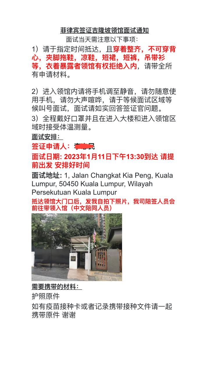 马来办理菲律宾入境签费用:咨询我们 需要预约,每周一三五下午2点面签,面签提前三工作日可以取消,三工作日内取消会有一定的费用,面签有名额限制具体预约时间等告知确认。需要提前提供电子版材料,预约面签:1护照首页信息扫描,2身份证正反面扫描,3彩色白底电子照片,4马来电子签电子文档,5疫苗记录扫描 6可以联系的电话号码确认面签时间后,提前1-2天入境马来西亚,面签当天有陪同人员带领,面试细节会告知。面签后目前5-6工出结果,代取护照送至客人酒店。