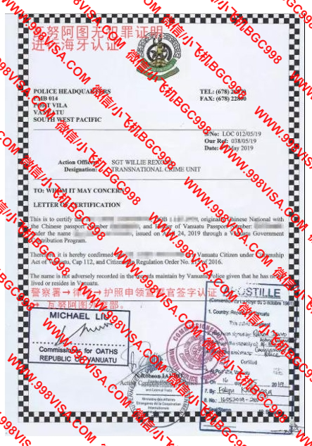 完成上述环节后,开始对客户的瓦努阿图无犯罪证认证:1、先从瓦努阿图警察署 开具客户的瓦努阿图无犯罪证明(后续服务清单内容);2、对开具出来的瓦努阿图无犯罪证明进行海牙认证;