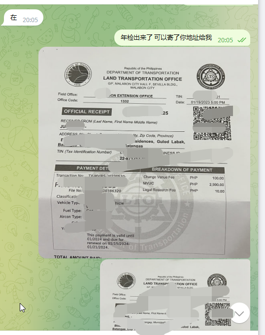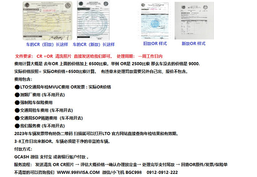 回到话题我们来说说免去年检的,材料很简单 就是OR +CR 照片 高清能看到文字即可,费用的话就是OR价格+6500比索,里面包含 汽车尾气检车  免出席   第三者足额保险强制险  验车费用 LTO免出席贿赂费用  我们的服务费用 等等。   和自己去的话费用下来差2000左右吧。