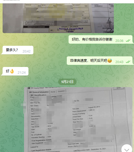收到客户委托办理汽车年检查询,客人发来OR CR图片后我们马上安排LTO 查档和估算价格,第一时间报价给客人。