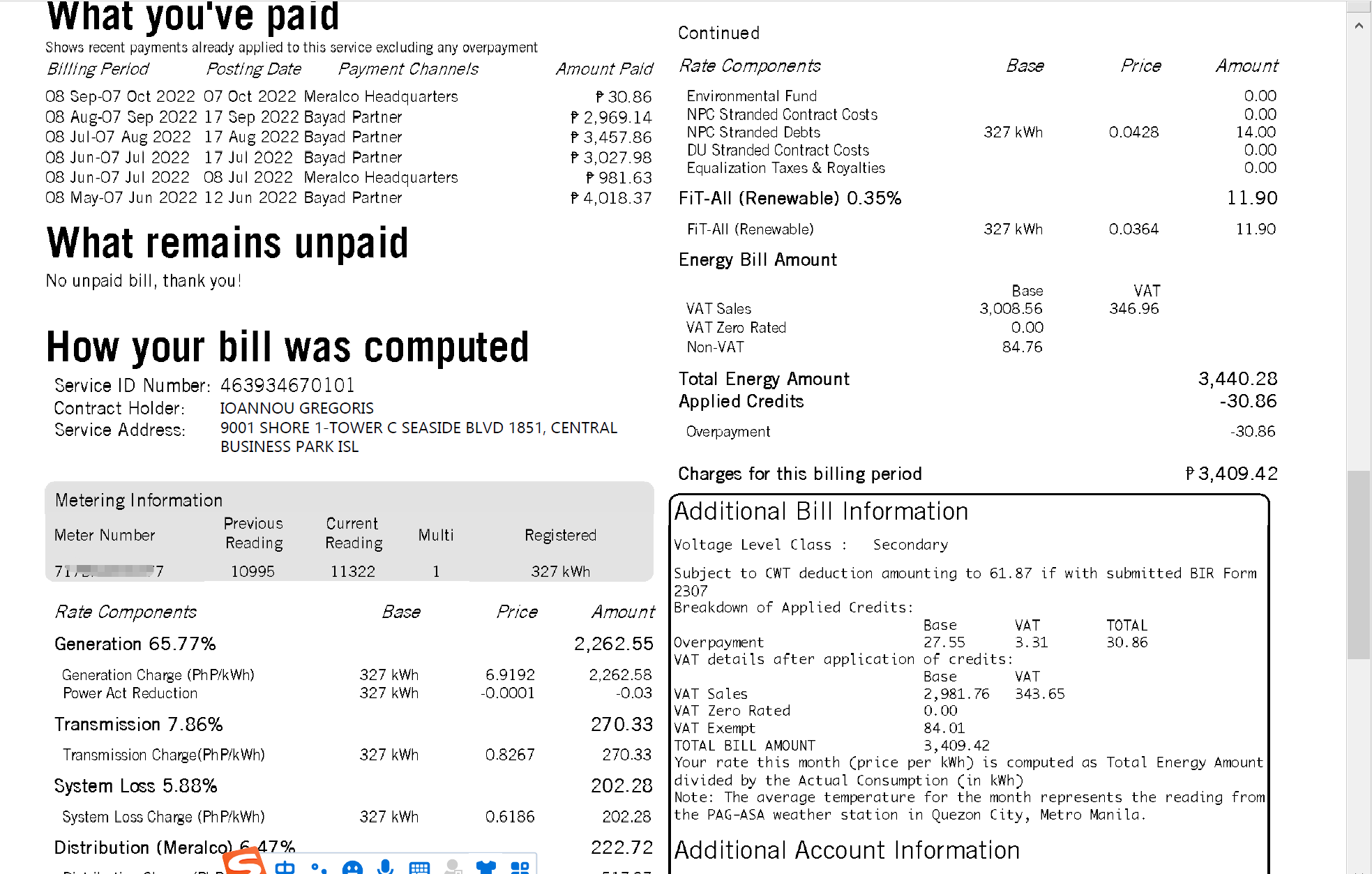 菲律宾的电力公司每个月都会给固定的邮箱地址发送用户的电费单,电费单可以作为申请一些手续 证件 银行开户等 需要的地址证明。 因为环保因素很多纸质单子现在已经被升级为电子账单,客人来自新加坡 因为要在新加坡开银行客户 被要求提供税务登记地的 相关地址账单证明 因此客人找到我们办理 协助办理地址证明。。。 欢迎咨询我们了解更多,微信BGC998 电报小飞机 @BGC998 优先咨询电报免验证直接咨询。 添加请主动告知咨询事宜 谢谢。