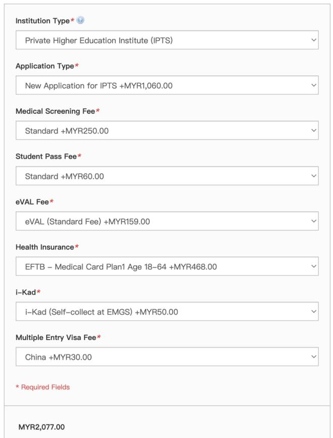 申请费用可以通过马来西亚教育部的官方网站计算,根据你所申请的大学的类型以及学习类型、保险类型等计算总体的签证费用,大学的签证费用一般最低(选择最基础保险)是2077RM(马币)。如果你觉得自己申请太麻烦,你也可以找相应的签证中介来进行申办,可能会有一笔中介费。