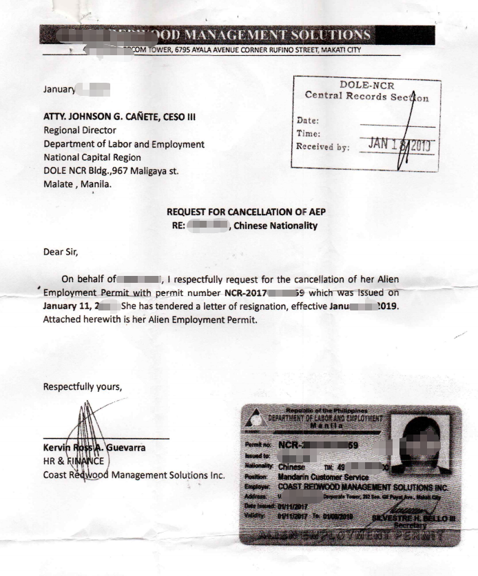 这个是由受聘公司发函给 劳工部申请注销AEP工作许可的 信件