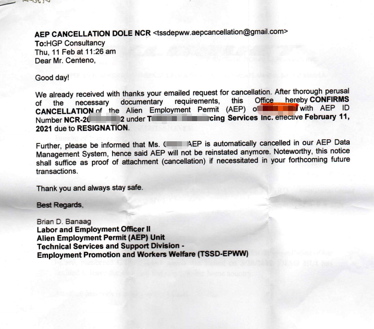 菲律宾劳工部的邮件回函 证明系统已经处理接受取消工作。