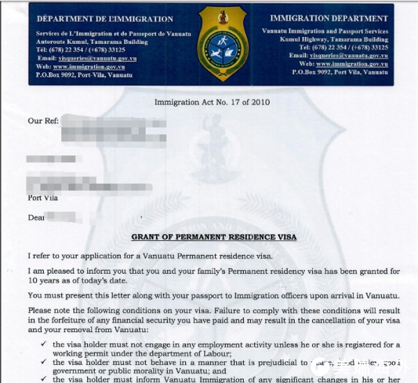 瓦努阿图绿卡获批文件