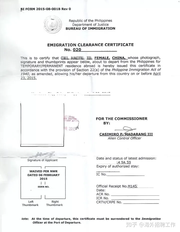 移民局发两种移民清关证书。这些都能在菲律宾国内任何的移民局卫星办事处和机场办理,具体参看下列描述:
