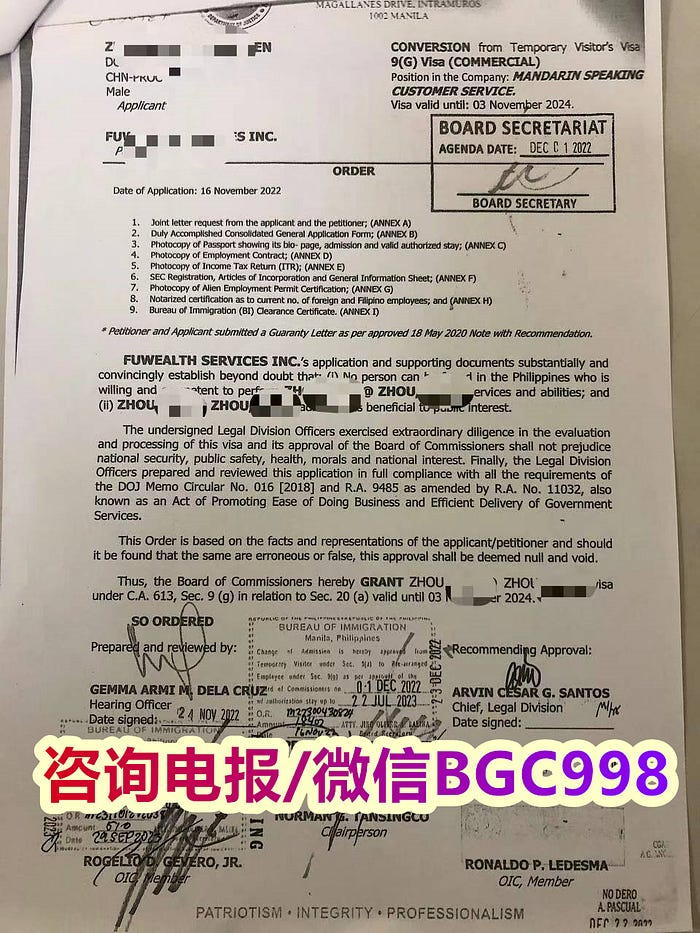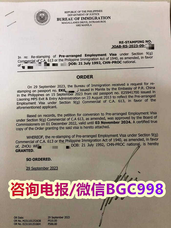 菲律宾9G签证就是大家都很耳熟能详的工作签证啦,持有9G签证的外国人就可以合法的在菲律宾工作,并且在9G签证的有效期内,你可以随意在菲律宾出境入境,不需要再办旅游签证按照政府的流程来走正规办理工签的流程需要3个月左右在怎么快也需要一个半月左右,所以那些一个月内完成的工签应该是假的AEP 没有注册的,签证速度不是越快越好,有些登报纸公示都要一个月后么有异议才能签发签证的。 更多相关信息欢迎您联系我们,微信:BGC998 电报 @WOW888 或 @BGC998 可优先使用TG免验证直接咨询,咨询请主动告知咨询业务,菲律宾998华人顾问 是菲律宾MAKATI 实体公司,客户 隐私安全保护服务可靠,可以安排工作人员上门取件或前往我们办公室提交办理业务。