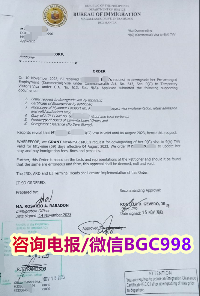 就是将目前所持有的签证降成为9a旅游签证,菲律宾有很多签证是需要降签才可以出境或者换工作。更多相关信息欢迎您联系我们,微信:BGC998 电报 @WOW888 或 @BGC998 可优先使用TG免验证直接咨询,咨询请主动告知咨询业务,菲律宾998华人顾问 是菲律宾MAKATI 实体公司,客户 隐私安全保护服务可靠,可以安排工作人员上门取件或前往我们办公室提交办理业务。