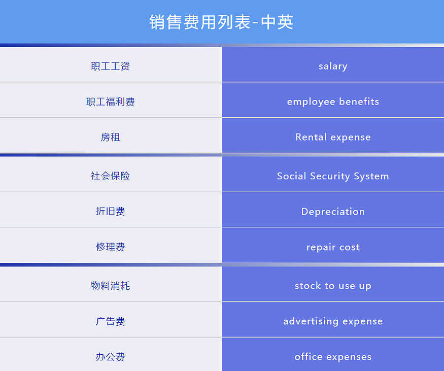 星小耀在上面列举10个较为常见的销售费用并附上中英对照,