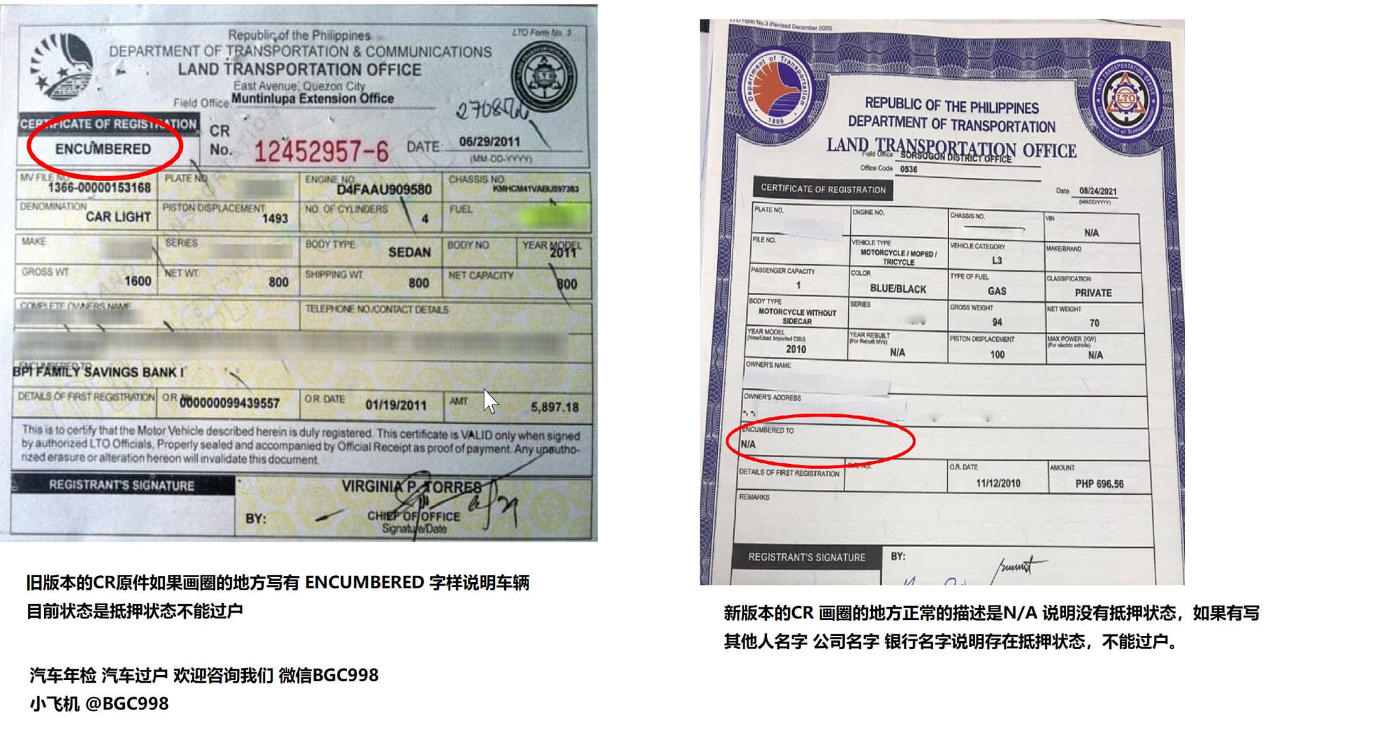 总之你拿到就是要赶干净的注册证的车辆才能够购买 不然 后遗症无穷。。。 买了就是一个不能过户 所有权不清晰的车,菲律宾汽车规定购买必须过户,你没过户路上检查到你是一个外国人开着本地人的车,要求你出对方的文件 火鬃对方的证件 要和对方验证 等 你就吃亏了,没过户 罚款 汽车可以扣押。。。。。