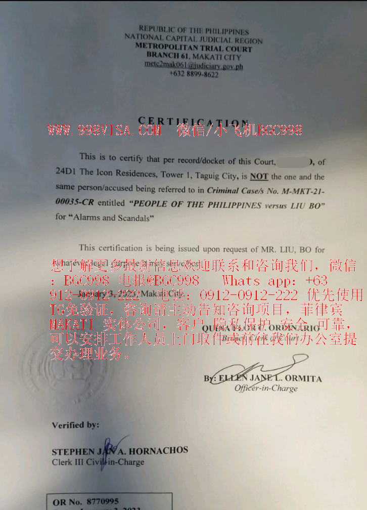 生活在菲律宾的小伙伴会遇到一个很棘手的问题就是做什么事情都有黑名单的查询或者相关的问题,一旦你和别人名字一样那你很难,做啥都要开证明。。。。特别是名字2个字的 哈哈 重名概率超级超级高。。。。哎,很多人遇到这个问题都会问我要怎么处理,开证明是挺容易的,但是没有买路钱 谁给你开?你去移民局 人家没有义务给你无违法 无不良行为证明。。。但是给了钱就是给你服务到位,需要移民局开无犯罪证明的 需要NBI开无犯罪证明的 需要法院开无犯罪证明的 需要菲律宾警察局开无犯罪证明的都可以联系我们 前提是你没有犯罪,重名等因素。我们会有人专门给您跑去咨询和整理材料去办理证明,但是有些地方也需要你本人出席才能拿到证明的就需要你配合下了,想了解更多最新信息欢迎联系和咨询我们,微信:BGC998 电报@BGC998 Whats app:+63 912-0912-222 电话:0912-0912-222 优先使用TG免验证,咨询请主动告知咨询项目,菲律宾MAKATI 实体公司,客户 隐私保护 安全 可靠,可以安排工作人员上门取件或前往我们办公室提交办理业务。