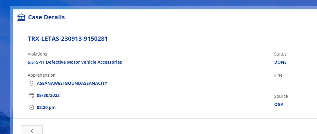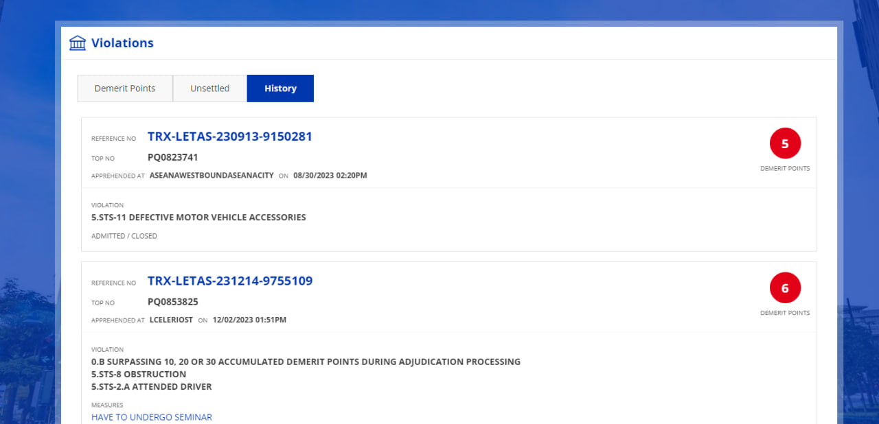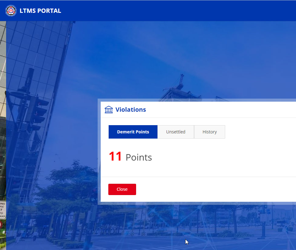 通过检查器可以轻松在线验证您的 LTO 违规情况。首先,使用您的驾驶执照信息登录您的帐户,然后点击“VIOLATIONS”(违规)。该门户将显示您的记过分数、罚款和违规历史记录。