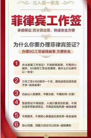 菲律宾工作签承诺保证:百分百出签、快速安全方便为什么你要办理菲律宾签证?办理9G工签省钱省事 方便安全合法居留工作签证!不怕移民局查,不用担心被抓,9G商贸工签全菲通用,做什么行业都可以~安全!三年工签4160菲币一个月,跟旅游签证续签差不多~省钱省事!自由出入菲律宾,不限次数,不限时间~方便!旅游签证不用续签,入境只要买张机票,不用办理来菲旅游签证,不用买双程机票~省钱省事不用保关,不用担心被遣返拉黑名单~安全省钱放心回国,回国之后还可以回来~超级便利