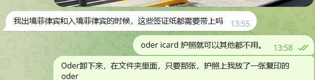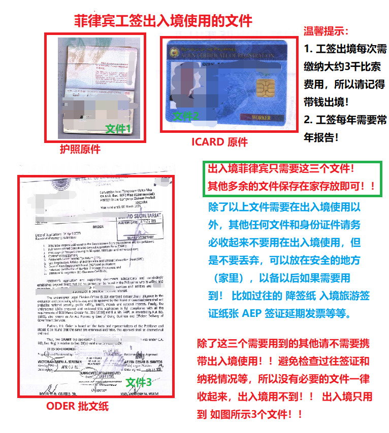 出入境菲律宾的话只需要带上 ICARD 原件 护照原件 和最新签证批文ODER即可,其他文件可以先收起来放在家里,但是不建议丢弃,比如几年前入境菲律宾的签证是另纸旅游签证,不要丢失,或许几年后你办理其他业务还会问到你这个文件。因为不少是落地签证偷偷转换成旅游签证等问题的客人,所以菲律宾移民局在办理业务的时候喜欢叫你提供过去的入境签证材料,这个时候你丢失了可能就要花一些不必要话的钱去打证明啥的,想了解更多最新信息欢迎联系和咨询我们,微信:BGC998 电报@BGC998 Whats app:+63 912-0912-222 电话:0912-0912-222 优先使用TG免验证,咨询请主动告知咨询项目,菲律宾MAKATI 实体公司,客户 隐私保护 安全 可靠,可以安排工作人员上门取件或前往我们办公室提交办理业务。