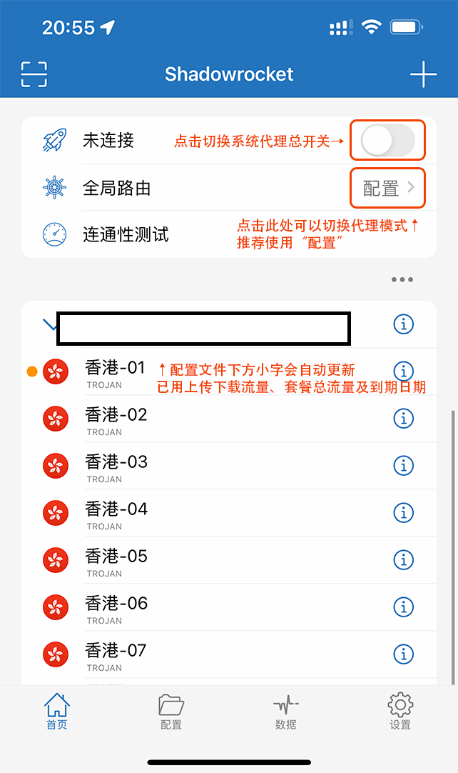 2. 进阶操作仅适用于客户端v2.0.0及更新版本。使用 Shadowrocket 客户端的用户可以自己指定所需的第三方配置文件,相比客户端自带的默认订阅配置文件,第三方配置文件还可以实现: