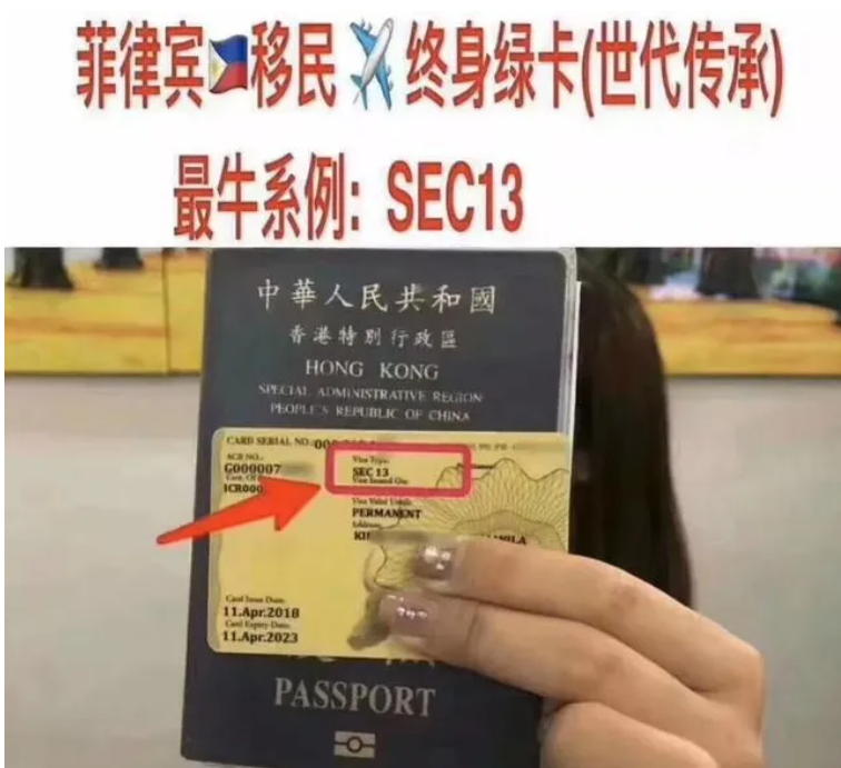 但是SEC13绿卡是可以申请第二个国家护照的。并且,菲律宾SEC13配额绿卡,是菲律宾的身份不属于菲律宾人,是菲律宾国民不是公民,相当于美国绿卡。再有,SEC13特殊的永久居留,可挂靠伴侣、儿女,以后儿女可挂靠伴侣及儿女。