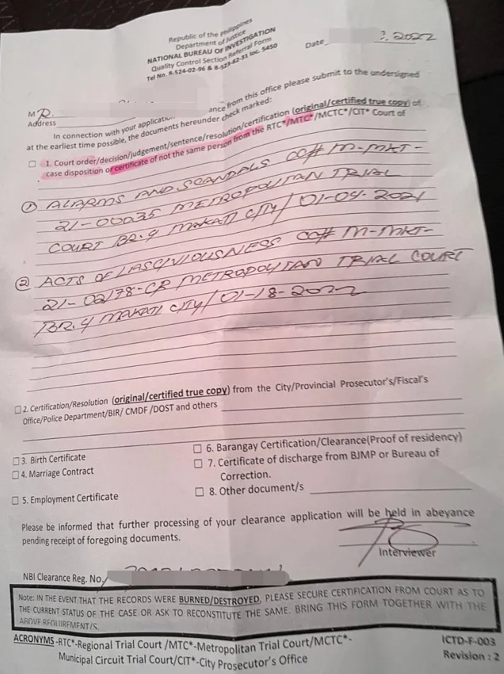 首先要在NBI 查询什么缘由导致不能办理无犯罪证明 然后去对应的单位开不是同一个人或者证明自己没犯罪的证明 这个客人 因为名字和不少人重合 所以需要 移民 局开不是同一人证明 然后2个不同法院开不是同一个人证明。。。。