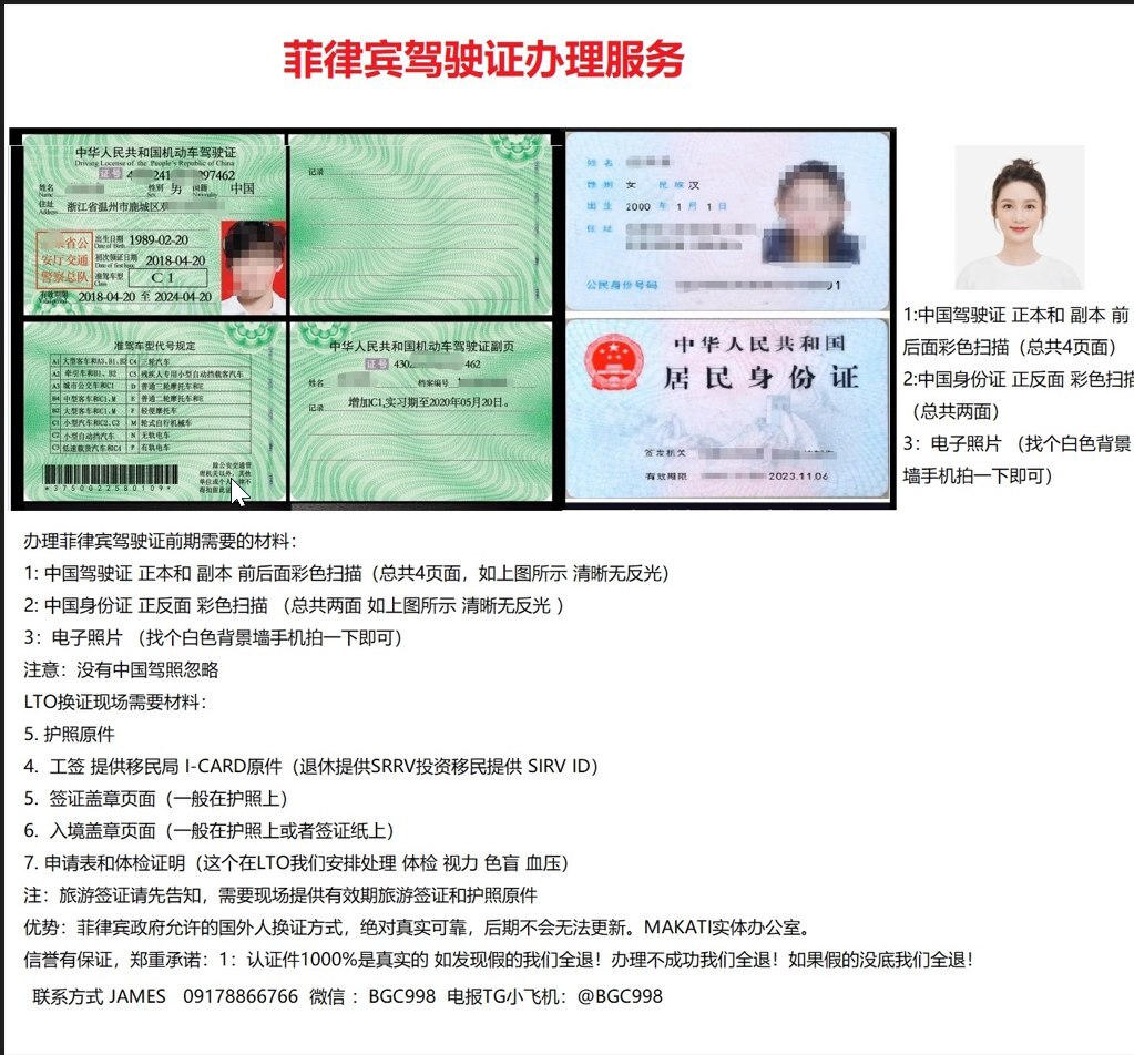 如果您手上有中国驾驶证 需要做另外一个国家的大使馆认证可以联系我们,做其他国家还是菲律宾驾驶证的公正认证都可以服务 有需要可联系欢迎咨询我们了解更多,微信BGC998 电报小飞机 @BGC998 电话/VIBER/WHAT'S APP+63-912-0912-222 优先咨询电报 WHAT'S APP 免验证直接咨询,添加请主动告知咨询事宜 谢谢。