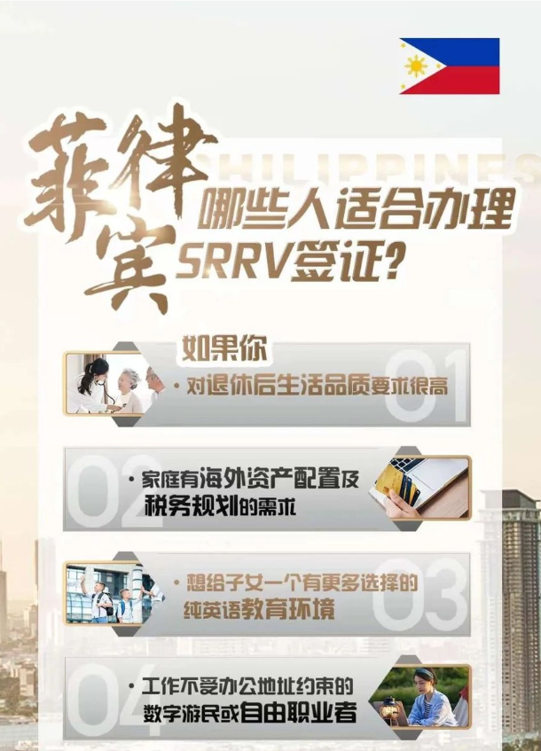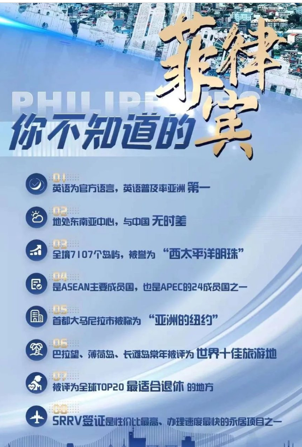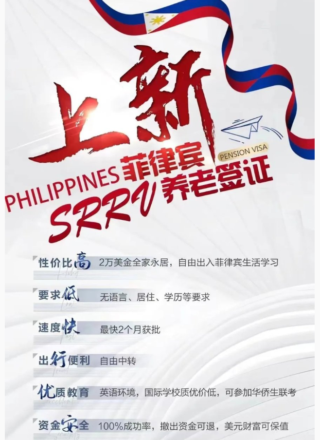 ⏩最快15天获批💵身份撤销时退回的是美元,外币资产保持。🆔可申请华侨身份,以华侨身份在国内投资,可依法享有政策优惠与税费的减免。子女以华侨身份参加华侨生联考,低分进入国内名校。🧾购买永久性房产(非土地),免征境外收入税和遗产税等。🪪全家永久居留,自由进出菲律宾。🏫子女可就读当地学校,无需办理学习签证,学费低廉(为欧美1/3)。➡️无学历语言要求,无移民监,无需提供资金来源证明🛫可持SRRV签证进入菲律宾中转,再使用第二护照去其他国家。🌏菲律宾与中国距离近,仅1小时时差👲菲律宾华人有八千万,华人社会地位很高,受人尊重。📚官方语言为英语,教育体制亦为美式,在菲律宾英语环境下学习英语,所需生活及教育费用均低于中国。🏝️自然环境优美,千岛之国,当地人热情好客,友好善良,是退休、休闲养老的好选择。