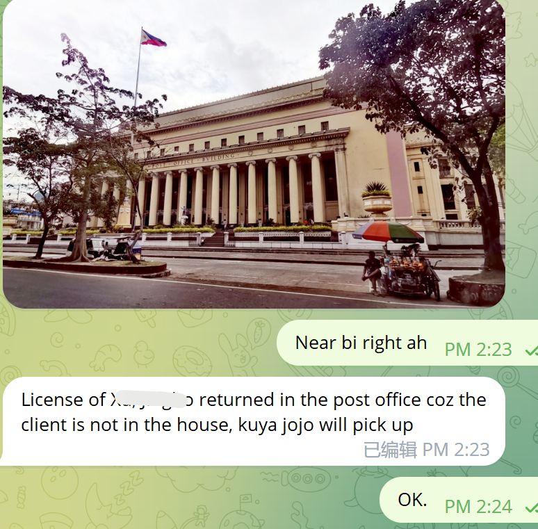 客人委托我们看LTO 寄的驾驶证2个月还没收到,我们先去LTO 查询快递编号 然后做授权书去邮局查询和截取挂号信文件, 这样终于耗时10天左右拿到挂号信 ,挂号信在邮局备注是 没人接收 不在家 退回邮局了。。。