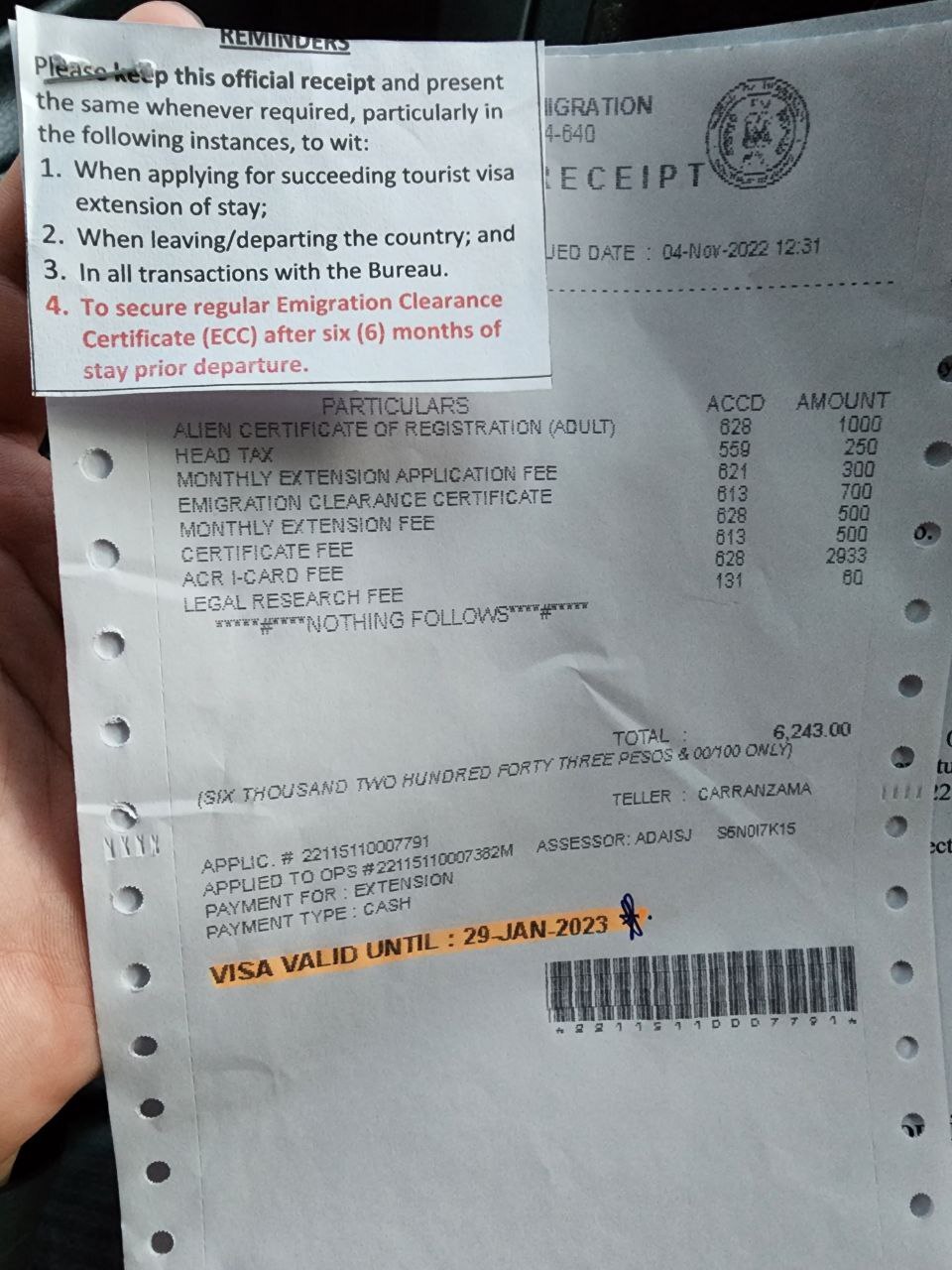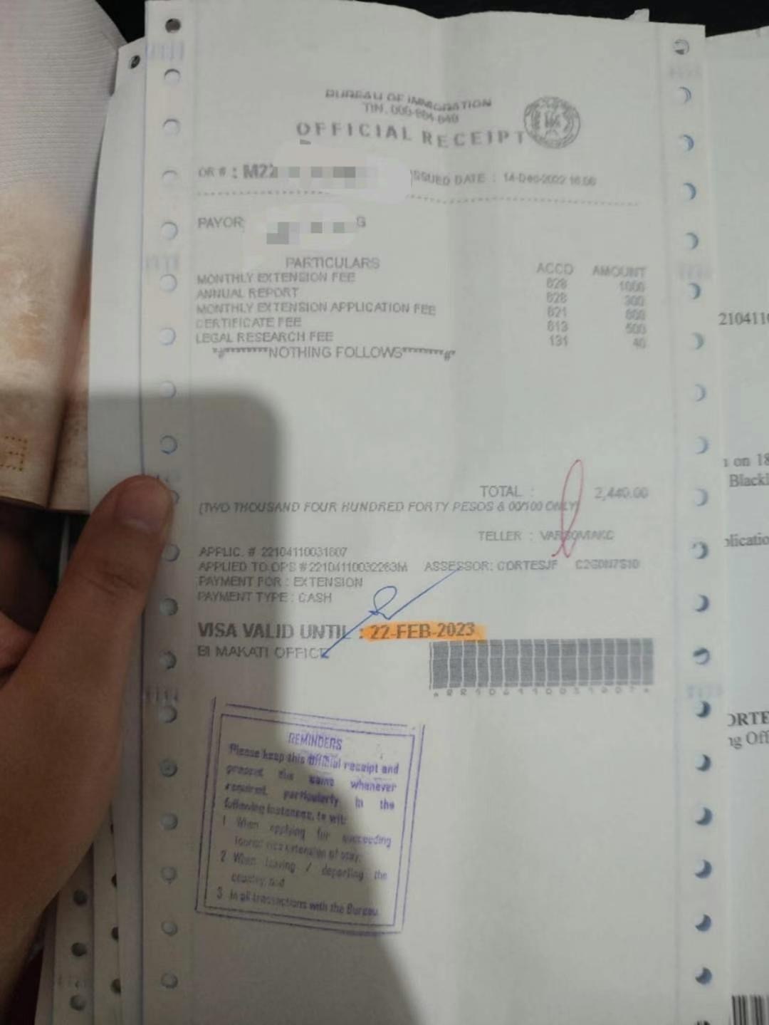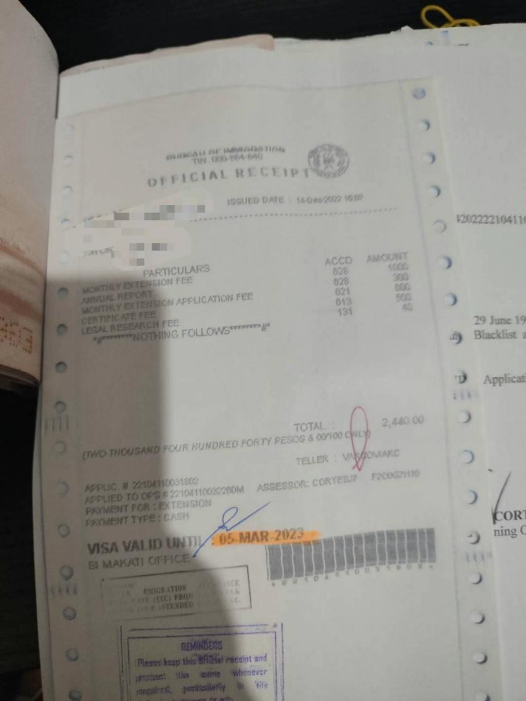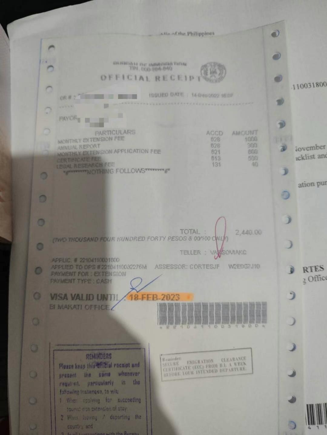 TRV 9A 旅游签证延期价格参考 第一次延期9A 会有多一个 2500左右比索的费用(有发票) 除了第一次后的延期月数发票价格参考 延期1个月 OR发票 3150 延期2个月 OR 发票5600 延期6个月 OR发票9640 注意:实际价格移民局发票为准,逾期每个月罚款500左右服务费用 : 延期1个月 1500比索 延期2个月 2000比索 延期6个月 3000比索 注意:实际价格以移民局正式发票为准(如果之前有未交费用被查出来都是需要补交的),您实际需要支付的总价= 移民局实际发票OR总价格+服务费用。 请根据自己需求来看延期多久,旅游签证累积最高延期为两年,超出需要MR局长批准 费用另外计算。 免签入境(美签 日签 加拿大签 澳大利亚等)延期14天 4500P比索时间: 1-2工作日 通常当天出来 (早上交下午取,下午交太晚就隔天出)材料: 护照原件 入境旅游签证 上一次延期发票 (如有)如果是其他签证刚降签后第一次延期,需要提供降签ODER批文。