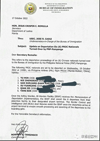 移民局局长诺曼·坦辛科(Norman Tansingco)在致司法部长克里斯平·雷穆拉(Jesus Crispin Remulla)的信中说中国公民于下午 2 点 40 分通过从马尼拉飞往中国武汉市的航班被驱逐出境。