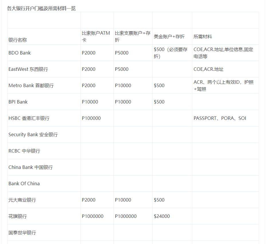 各大银行特点对比一、BDO Bank (推荐指数高)分行数最多、ATM机最多,提款方便!银行审卡期约一、一周能拿到ATM卡!每日ATM机提款限额比较少,只有25000php,单笔每次10000pBDO银行业务非常广泛,功能也特别齐全,尤其体现在个人贷和商业贷方面,是菲律宾为数不多能给外国人提供购房贷款的银行,地位类似国内的招行手机银行 (Mobile Banking)与网路银行 (Online Banking),UI介面设计佳,可线上支付帐单或购买Globe充值卡。二、BPI Bank分行数次多,银行审卡期与BDO Bank差不多!行员服务还不错!手机银行 (Mobile Banking)介面较旧,有待改进!三、首都银行 Metro Bank第三大菲律宾本土银行,全方位菲律宾资产管理,推荐!开户快速、银行审卡快,现场办理即可拿到,约略一个小时!行员服务品质佳!四、Security Bank这银行就如其名,相关人士表示该银行其「安全性」非常高五、RCBC Bank开户种类多元,适合不同族群,但银行审卡较麻烦!行员服务态度热情、友善!五、China Bank注:China bank不等同于Bank of China,是1920成立于菲律宾的一家私人银行,因为Bank China被这家银行注册了,所以国内的中国银行才会用Bank of China这个名字。询问行员表示「只接受ACR-I卡正本」开户,秀出蓝卡NCR仍被婉拒,规矩死板!六、花旗银行适合「高资产族群」,行员服务极佳,但开户门槛过高。七、国泰世华银行现无一般存款业务。仅提供企业融资、贷款业务。八、兆丰国际银行开户门槛低,美元开户门槛容易,仅100美元,且申请文件填写容易 (2018/4/3更新:困难开户,需要ACR 9G签证正本),附有中、英对照,经理是台湾人。有美元读钞机,美元存款方便。地点在马卡蒂路 (Makati Ave)。九、元大银行开户容易,行员服务良好且颜值高。 (2018/4/3更新:协助朋友开户实测成功,不需要地址证明、不需要9G签证正本,蓝卡工作签证即可)地点邻近PBCOM大楼 (PBCOM Tower)。十、菲律宾国家银行 Philippine Nation Bank开户容易,一次完成,开户存折本与网银开通。 (只拿蓝卡、护照及现金)
