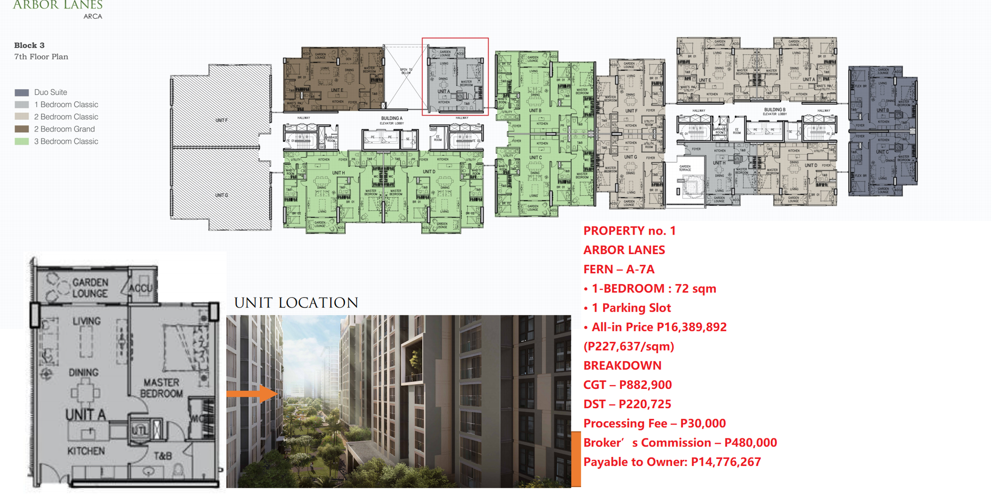 PROPERTY no. 1ARBOR LANESFERN – A-7A• 1-BEDROOM : 72 sqm• 1 Parking Slot• All-in Price P16,389,892 (P227,637/sqm)BREAKDOWNCGT – P882,900DST – P220,725Processing Fee – P30,000Broker’s Commission – P480,000Payable to Owner: P14,776,267Ayala’s Total Contract Price Now For This Unit (with 10% Cash Discount) is P20,709,581 or P287,633/sqm