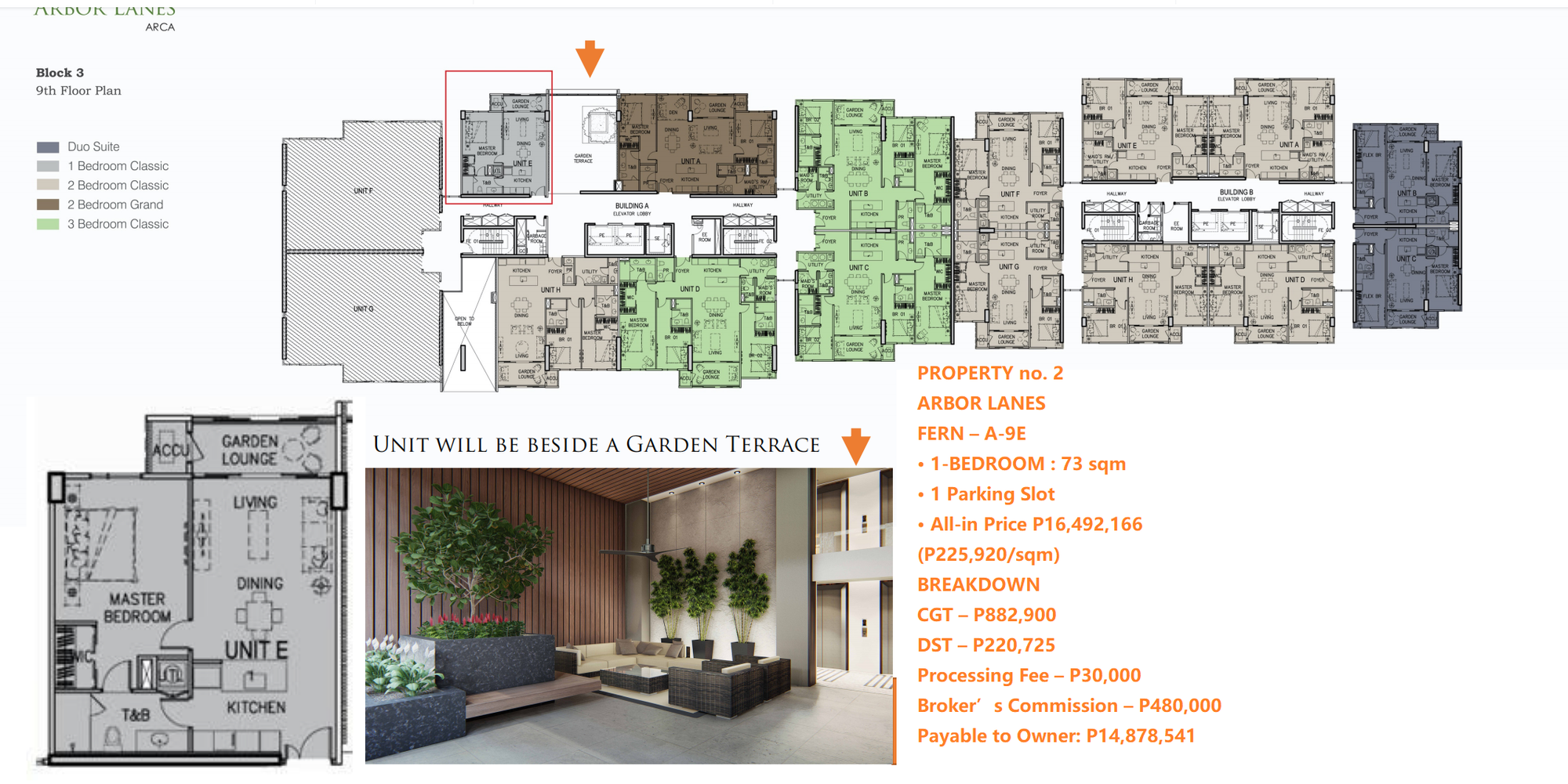 PROPERTY no. 2ARBOR LANESFERN – A-9E• 1-BEDROOM : 73 sqm• 1 Parking Slot• All-in Price P16,492,166 (P225,920/sqm)BREAKDOWNCGT – P882,900DST – P220,725Processing Fee – P30,000Broker’s Commission – P480,000Payable to Owner: P14,878,541Ayala’s Total Contract Price Now For This Unit (with 10% Cash Discount) is P20,857042 or P285,713/sqm