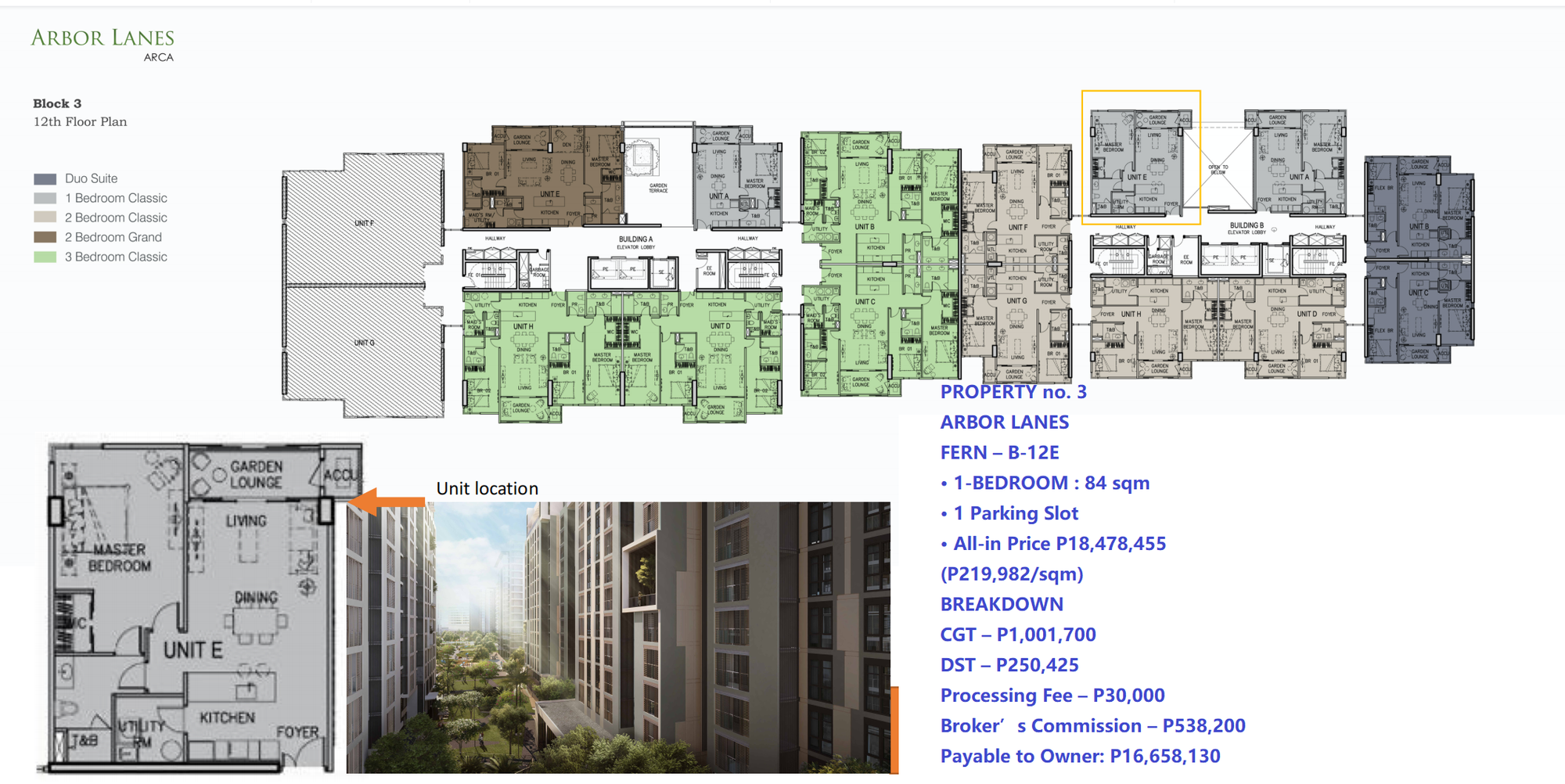 PROPERTY no. 3ARBOR LANESFERN – B-12E• 1-BEDROOM : 84 sqm• 1 Parking Slot• All-in Price P18,478,455 (P219,982/sqm)BREAKDOWNCGT – P1,001,700DST – P250,425Processing Fee – P30,000Broker’s Commission – P538,200 Payable to Owner: P16,658,130Ayala’s Total Contract Price Now For This Unit (with 10% Cash Discount) is P23,489,839 or P279,641/sqm