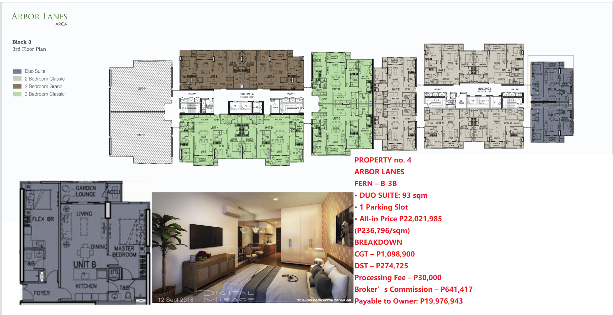 PROPERTY no. 4ARBOR LANESFERN – B-3B• DUO SUITE: 93 sqm• 1 Parking Slot• All-in Price P22,021,985 (P236,796/sqm)BREAKDOWNCGT – P1,098,900DST – P274,725Processing Fee – P30,000Broker’s Commission – P641,417 Payable to Owner: P19,976,943Ayala’s Total Contract Price Now For This Unit (with 10% Cash Discount) is P28,408,807 or P305,471/sqm