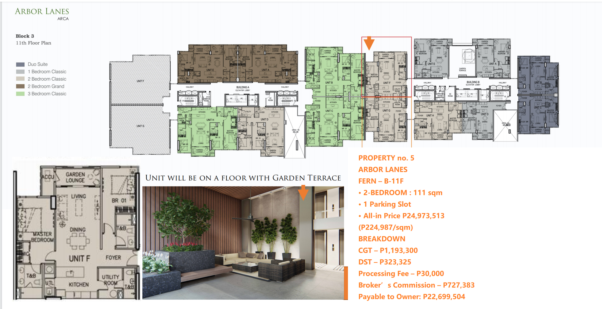 PROPERTY no. 5ARBOR LANESFERN – B-11F• 2-BEDROOM : 111 sqm• 1 Parking Slot• All-in Price P24,973,513 (P224,987/sqm)BREAKDOWNCGT – P1,193,300DST – P323,325Processing Fee – P30,000Broker’s Commission – P727,383 Payable to Owner: P22,699,504Ayala’s Total Contract Price Now For This Unit (with 10% Cash Discount) is P32,271,058 or P290,730/sqm