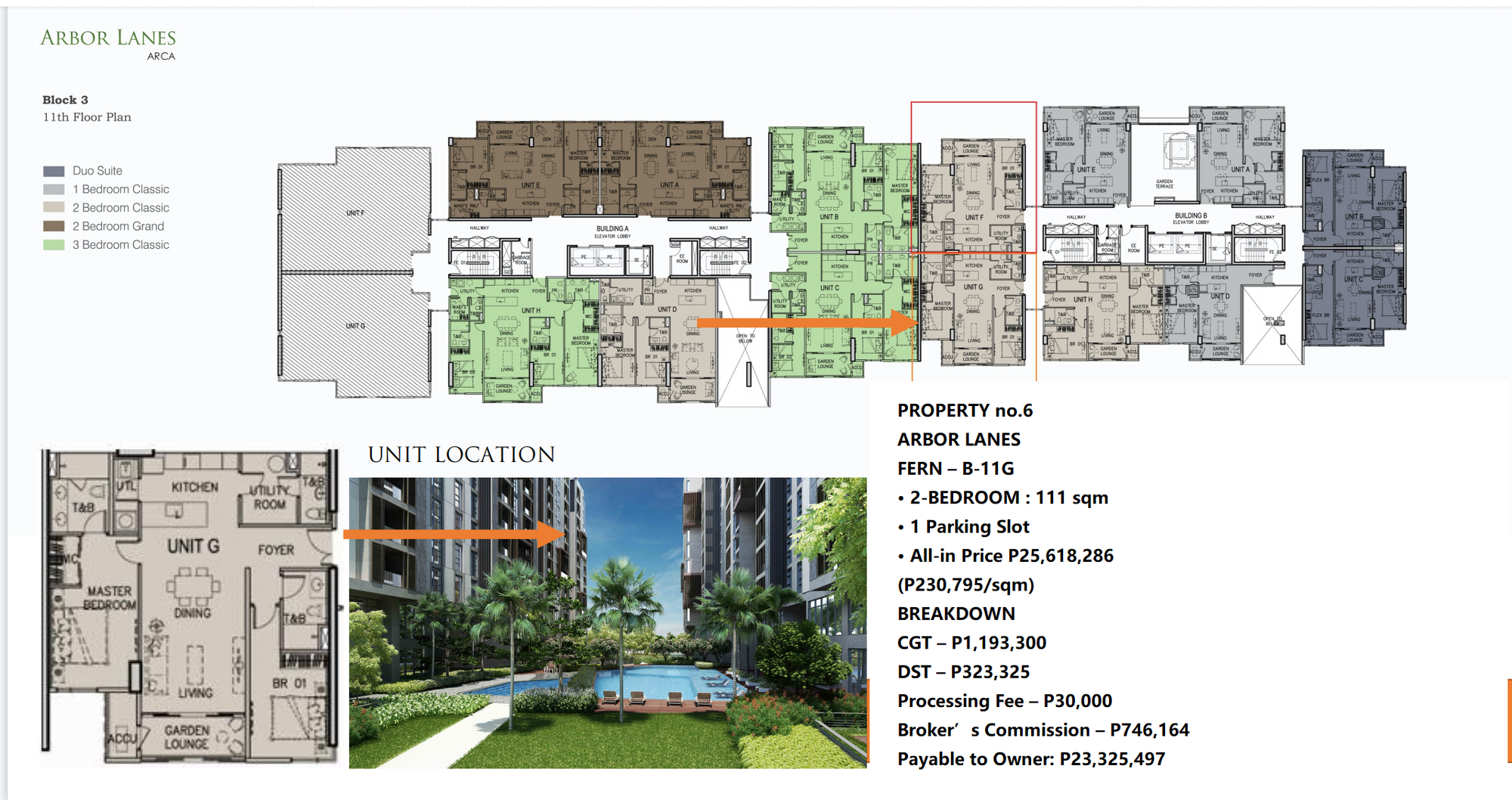 PROPERTY no. 6ARBOR LANESFERN – B-11G• 2-BEDROOM : 111 sqm• 1 Parking Slot• All-in Price P25,618,286 (P230,795/sqm)BREAKDOWNCGT – P1,193,300DST – P323,325Processing Fee – P30,000Broker’s Commission – P746,164Payable to Owner: P23,325,497Ayala’s Total Contract Price Now For This Unit (with 10% Cash Discount) is P33,190,647 or P299,014/sqm