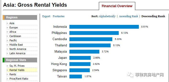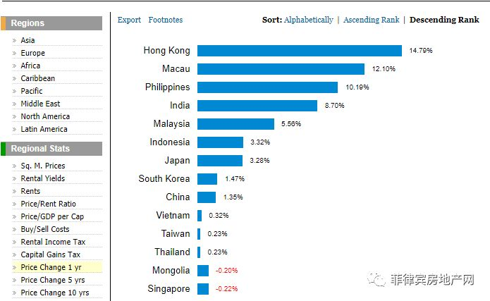在来看下房子本身价值的涨幅,除去千金难买一亩地的香港和澳门,菲律宾的涨幅排名第一达到10.19%,这还只是一年的数据。想想看只要不到8年的时间房子的租金回报率加上房子本身的升值,只要8年你就白拿一套房高效回报的房子,低投资高回报何乐不为?