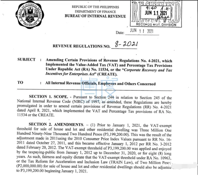 按照菲律宾税收法,以及菲律宾税务局(BIR)更新的RR13-2018法令中有关增值税(VAT)的部分,增值税三年一调整,2021年,正好属于调整之年。