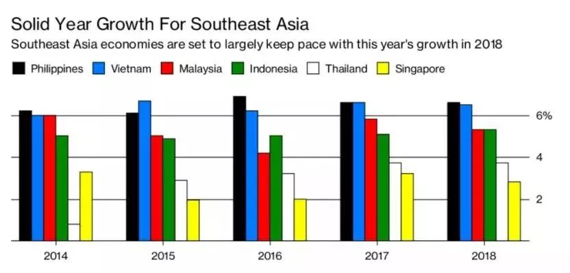 彭博社也预测2018年菲律宾和越南将分别以6.6%和6.5%的经济增速位列东南亚前茅。图片