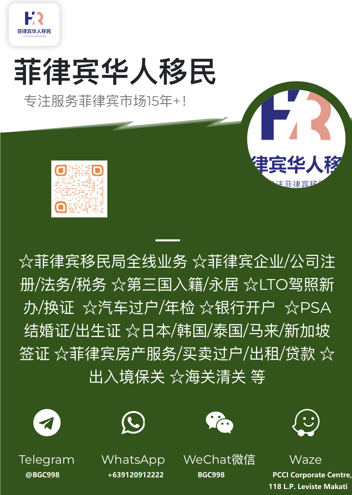 菲律宾华人移民专营菲律宾市场近20年! MAKATI实体注册公司,持有 移民局/旅游局/工贸部/退休署/外交部/劳工部/司法部/税务局/等政府单位授权 信誉有保证 .主营:菲律宾移民局全线业务,公司注册以及财税,房产/不动产/法务相关服务 法规入籍第三国家入籍等 .移民局全部业务:9A旅游签证 入境VIP保关 机场捞人 出入境记录/查询/补录 特赦签证 13A结婚签证 TRV 9F 学生签证 9G工签办理/降签/补办/续签,黑名单查询/清除 退休移民 投资移民 ASRV 工签降签 AEP办理 ACR I-CARD 更新 年检 补办 菲律宾遣返VDO OS OTL业务 菲律宾签证续签 逾期罚款处理 各种签证查询 ECC清关 旅游签证延期 原有长期签证更换国籍 落地签证疑难杂症 SRRV更新 SRRV取消 SRRV退费 MCL21特赦 补盖章 MR处理 RECALL BLO WLO HDO LIFTING 菲律宾婚签 MR办理交通部LTO:汽车年检/免出席年检 车牌 OR/CR补办 汽车过户 驾驶证新办/更新/补办 中国驾照换菲律宾驾驶证 CDE考试包过 解除汽车抵押 等外交部DFA:菲律宾护照 菲律宾文件认证 菲律宾海外领馆文件认证等税务局BIR:企业所得税 企业审计 个人所得税 发票印制 税卡TIN 等市政府CH:公司注册 建筑许可 卫生许可 营业许可 装修许可 消防许可 地基税 等工贸部SEC/DTI:公司注册 公司变更 等劳工部DOL:AEP 员工登记 员工开除登记 海外员工登记 AEP取消 等统计局PSA:菲律宾结婚登记 菲律宾出生登记 菲律宾死亡登记 菲律宾离婚登记 等房产托管:房屋/公寓/商铺租赁/买卖 房产入户/过户 房产贷款 房产抵押/解除抵押 地基税 等银行开户:信安银行 联合银行 AUB EASTWEST 等菲律宾旅游:长滩岛 克隆岛 薄荷岛 以及马尼拉周边客制旅游第三国签证:菲律宾入境签证 泰国签证 马来西亚签证 韩国签证 日本签证 新加坡签证 印尼签证 等中国大使馆:护照申请 护照补发 护照更新 文件认证 赴华签证办理 在华签证延期 在华工作签证 香港签证菲人力资源服:菲籍猎头/ 人事代管服务第三国籍:多米尼克 圣基茨 圣卢西亚 安提瓜和巴布 瓦如阿图 格林纳达 土耳其 , 墨西哥 印尼 巴拿马 几内亚比绍 瓦努阿图绿卡第三国籍配套:护照激活 税务登记 驾驶证 无犯罪证明 电话卡 银行开户 激活护照 地址证明 护照/挂失/损坏更新 等 (以上国家的都有)其他服务:NBI证明 海牙认证 FDA食药检局注册 IPO商标注册 商标专利转让/注册 BOQ防疫局证明 BOC海关清关 中国驾驶证更新 菲律宾在职证明 菲律宾银行贷款 菲律宾银行开户 中国无犯罪证明 国际驾驶证IAA 园区捞人 警察局捞人 监狱捞人 等咨询 微信 BGC998 电报 @BGC998 WHAT'S APP+63 9120912222